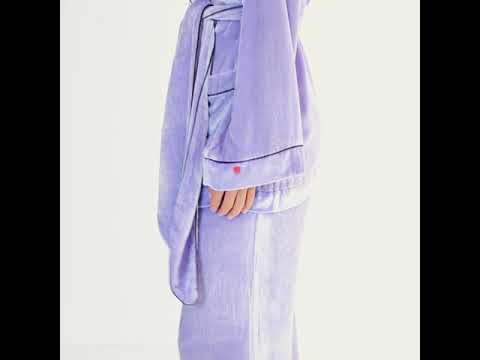 Made from plush silk velvet, two practical side pockets, edged with satin feel black piping and accompanied by a versatile tie belt. The wrap around robe features a luxurious shawl collar and kimono bell sleeves.