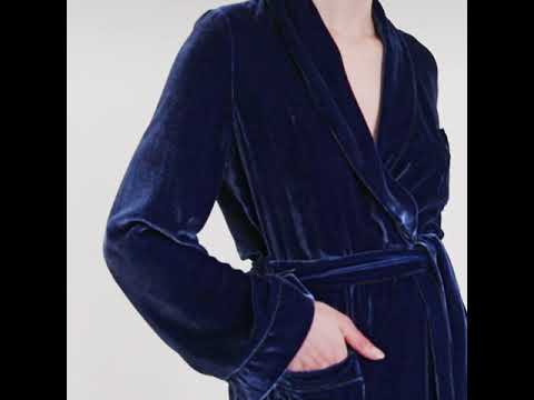 Made from plush silk velvet, two practical side pockets, edged with satin feel black piping and accompanied by a versatile tie belt. The wrap around robe features a luxurious shawl collar and kimono bell sleeves.