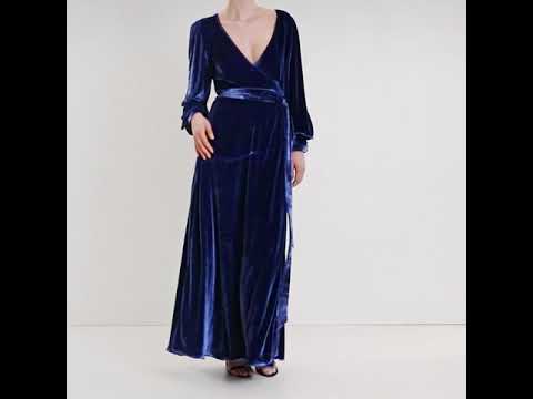 Made from a deep blue silk velvet, this maxi length full skirt wrap-around dress features a plunging neckline and keyhole back, billowy balloon sleeve, wide cuff detailed with self-covered buttons and elastic loops, with belt loops at waist. The removable wide sash belt allows flexibility in adjusting fits.